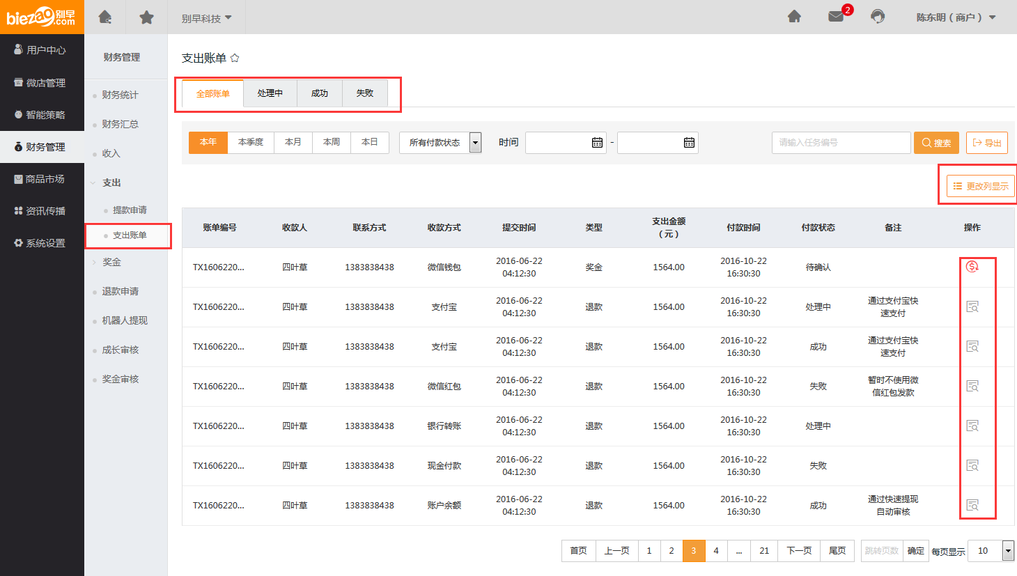 【支出账单】:能够查看“在处理中”和“成功”及“失败”三种状态的账单信息,查询支出账单的编号、支出金额、以及到付款等信息,如下图:
