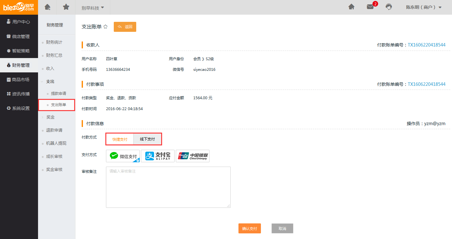 “待确认”状态下的账单可以点击【支付】,可以看到收款人信息,选择“快捷支付”和“线下支付”,如下图: