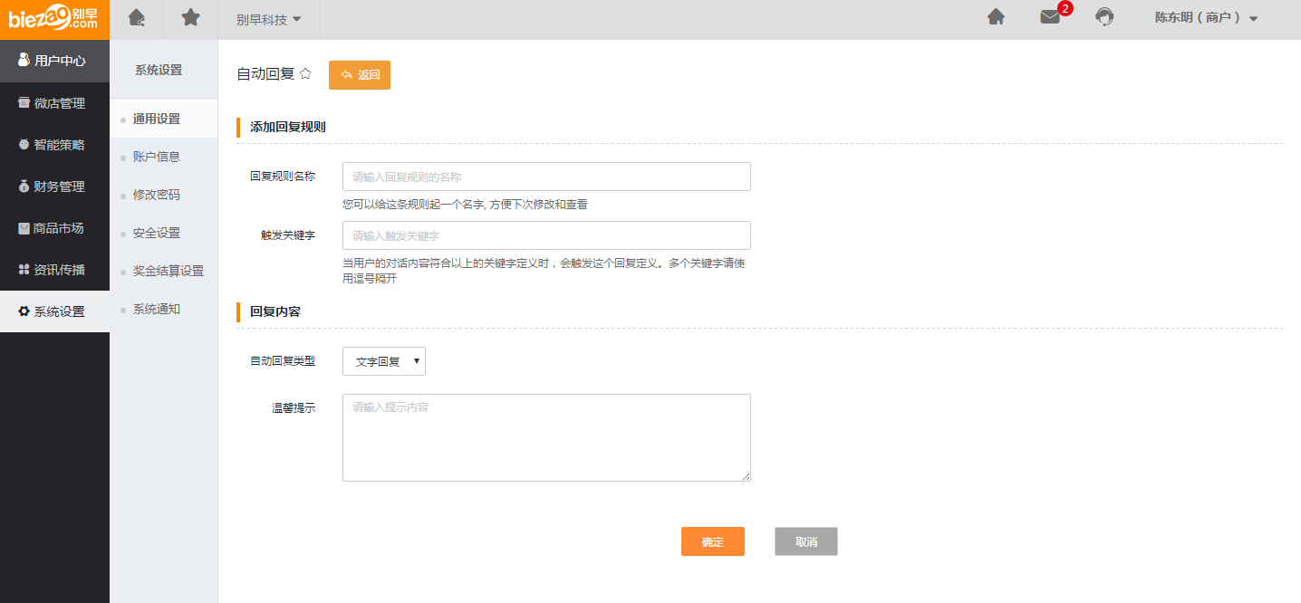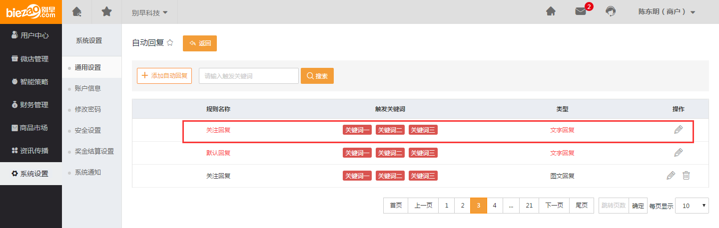如上图,添加关键词自动回复,需要点击左边的“新建自动回复”并编辑好这个规则的名称输入关键字,选择全匹配或者模糊匹配。(注意事项:模糊选项是假如你设置了ab,用户回复ab,或abcd才可以自动回复。而回复a是没有自动回复的。只多不少啊)最后编辑好回复内容;关键字可以关联图文、店铺主页、会员主页等内容;