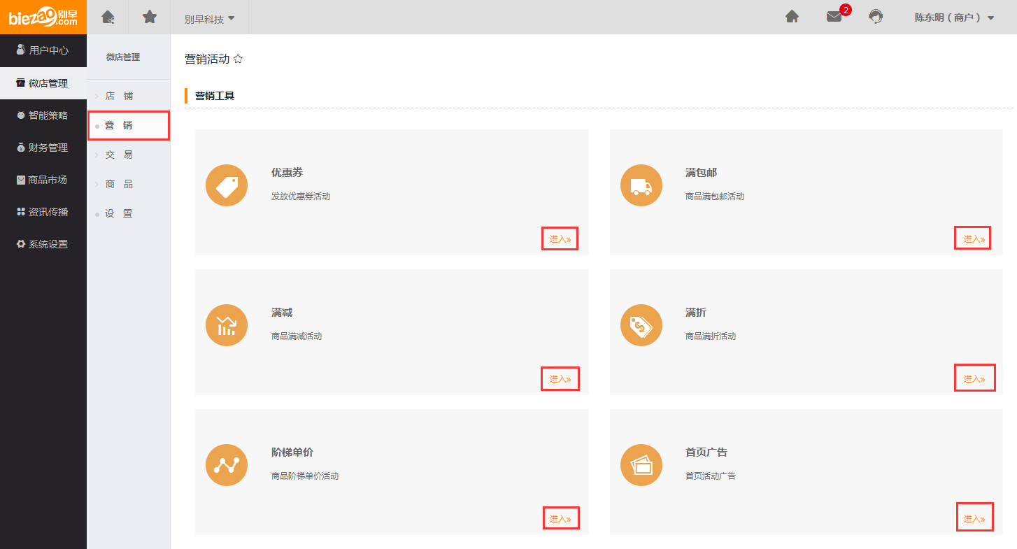【营销工具】:通过选择以下六种方式创建促销活动,发放优惠券等各种方式提高用户参与度,如下图: