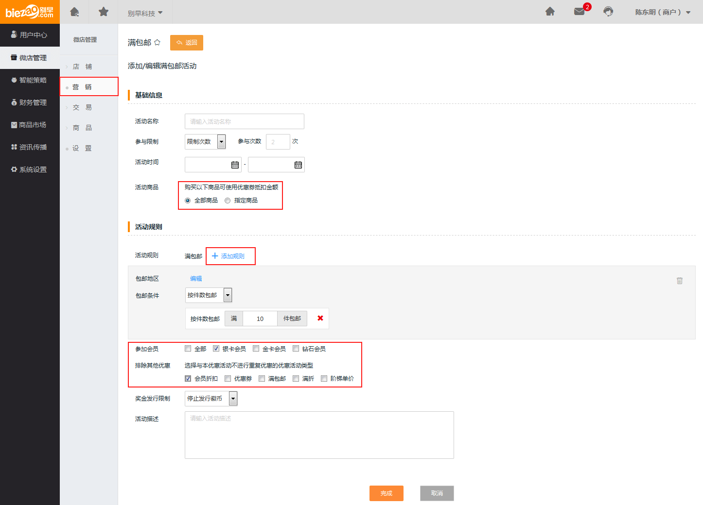 可以选择【全部商品】或者【指定商品】,填写相应的活动信息及活动参与的会员类型、规则,点击完成: