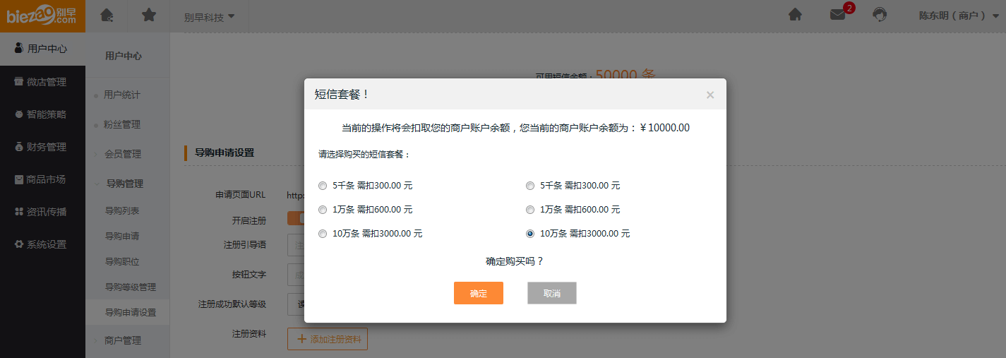 【导购等级管理】主要是申请导购员职位的设置,可以【购买短信】和【添加注册资料】,如下图:
