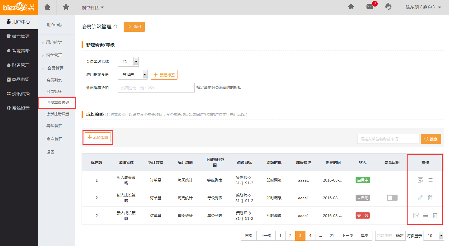 点击【添加等级】,可以编辑【新建/编辑等级】、【成长策略】、【激励策略】、【等级描述】,【新建/编辑等级】主要是对会员的等级和标签,会员消费折扣设置;成长策略中可以“添加策略”、“ 查看”、“列表”、“编辑”、“删除”。