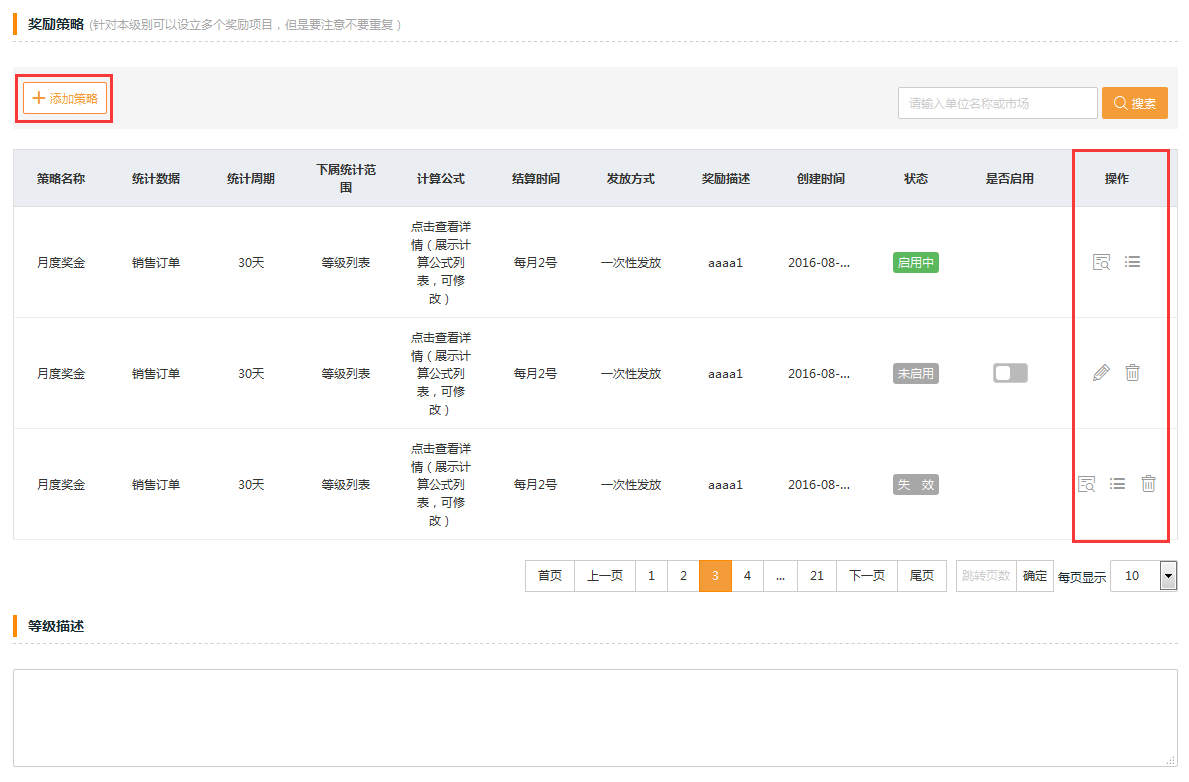 “奖励策略”可以进行【添加策略】、【查看】、【列表】、【编辑】、【删除】;如下图: