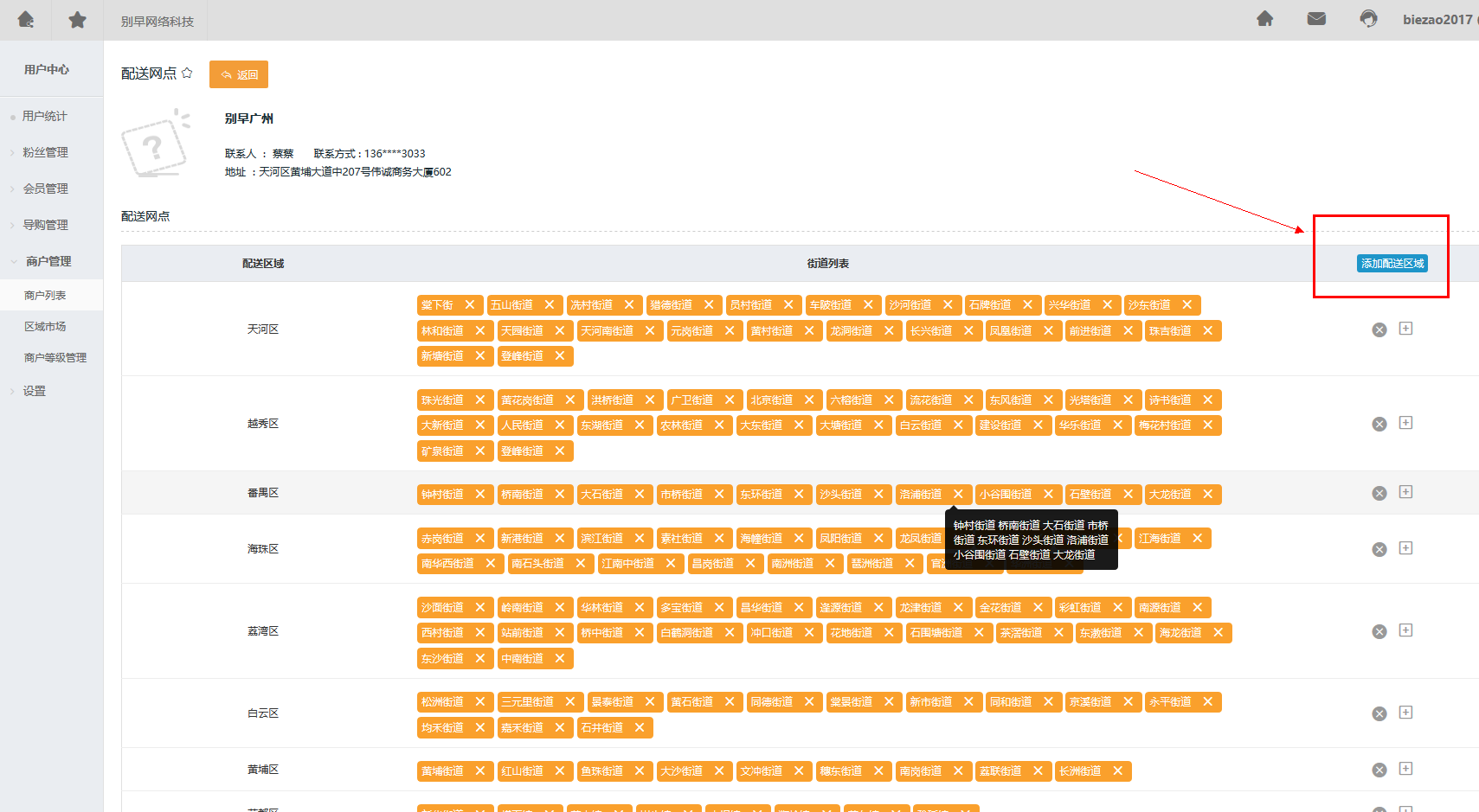 第三步 添加配送区域,例如广州的天河区、越秀区等。