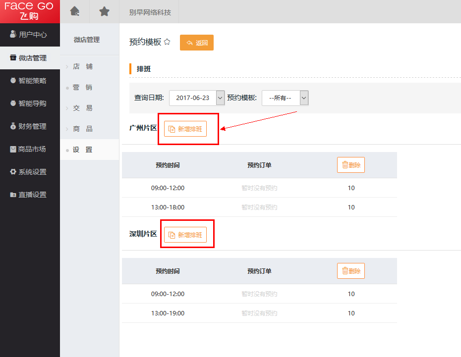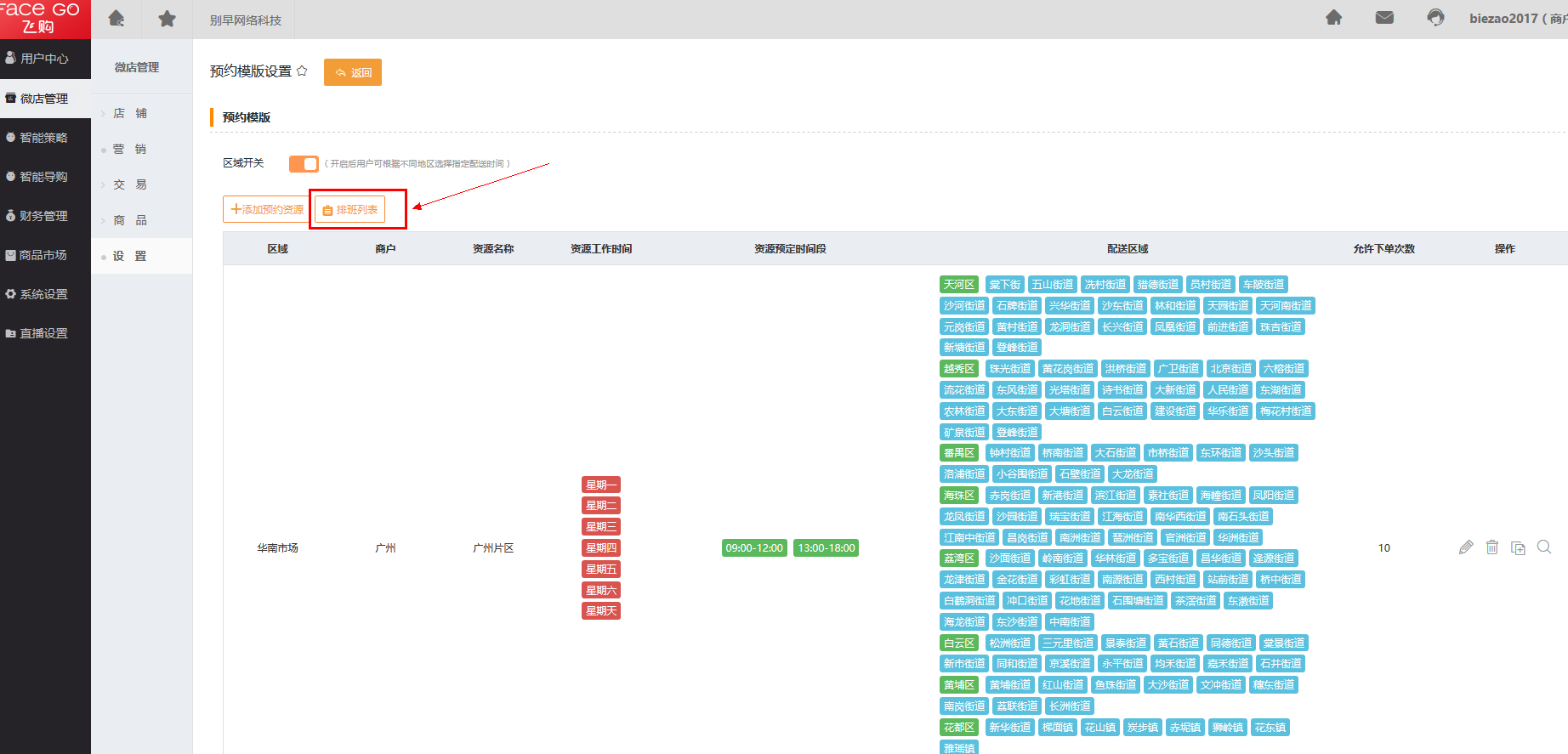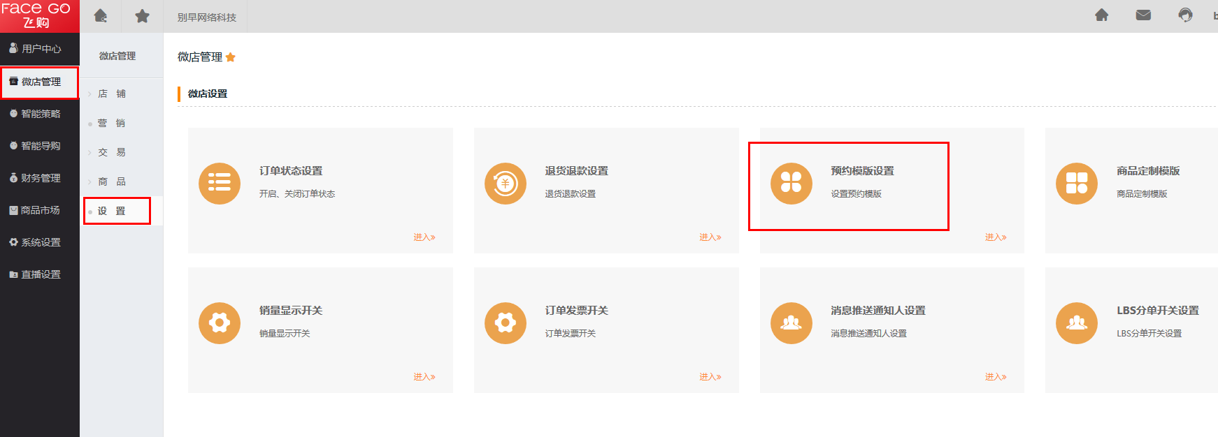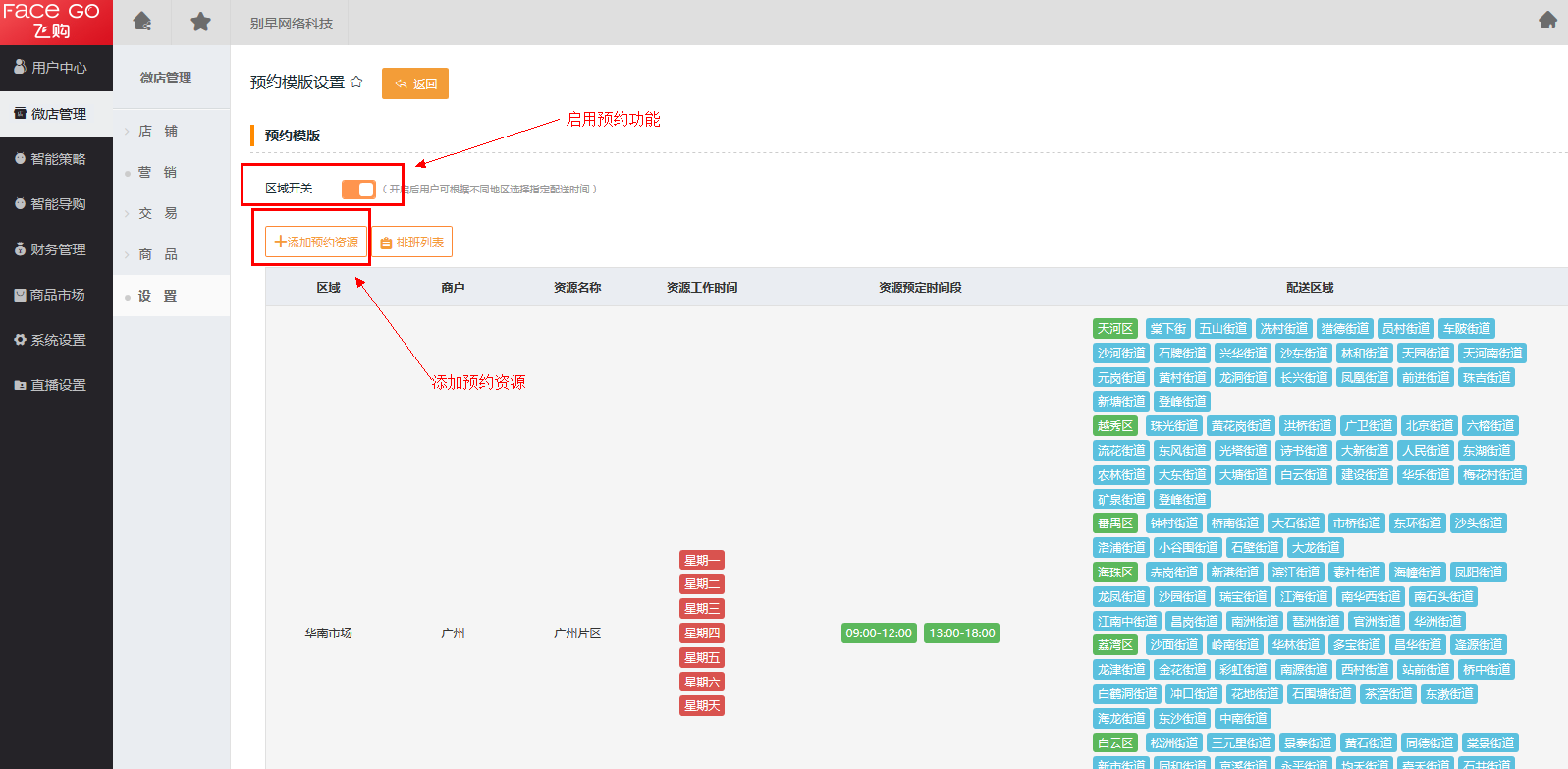 第五步 启用【预约模板设置】,操作路径:微店管理 -> 设置 -> 预约模板设置 -> 区域开关。