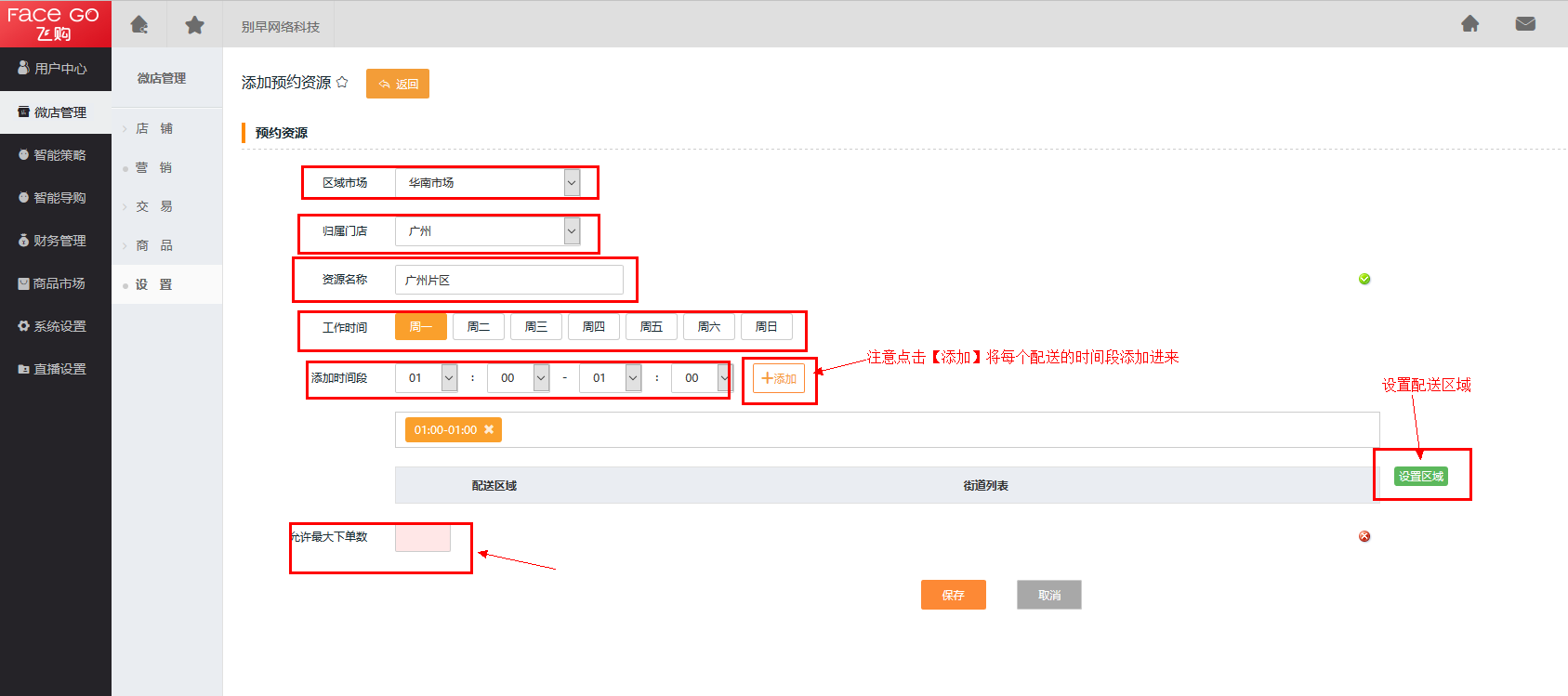 第七步 设置区域市场、归属门店、资源名称、工作时间、添加时间段、配送区域。