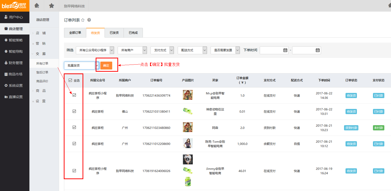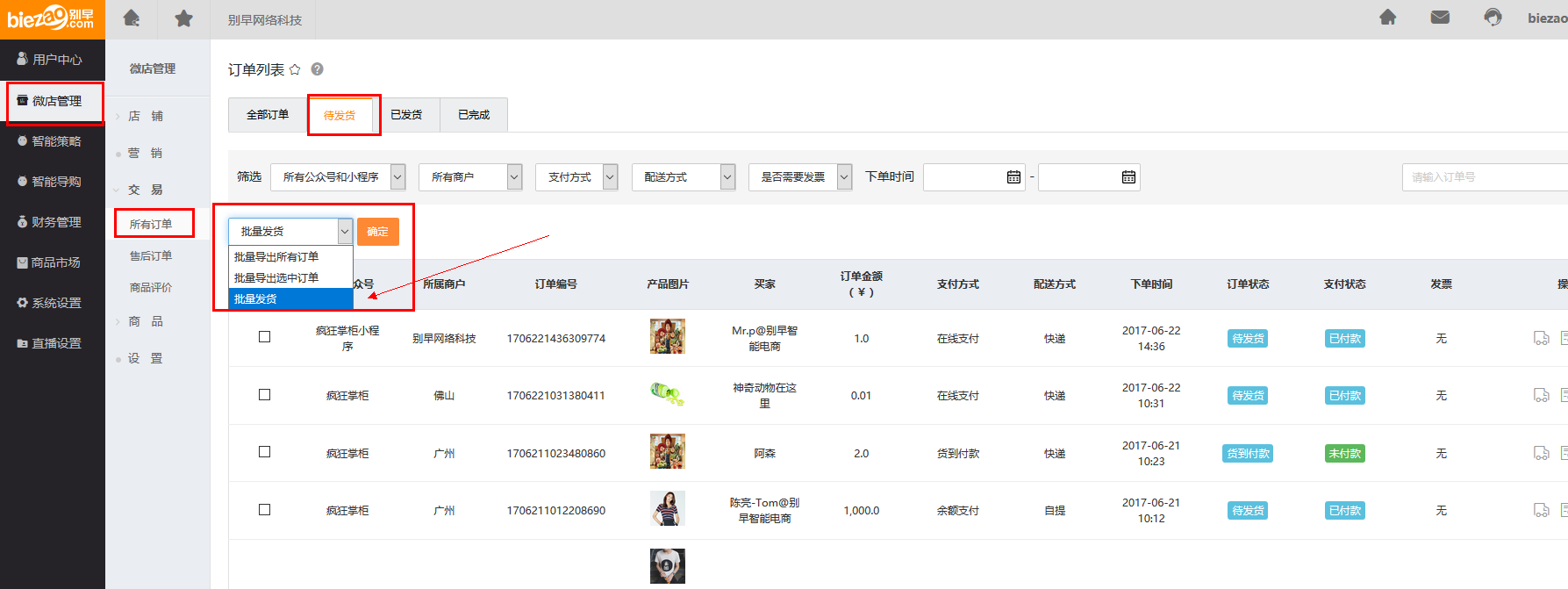 第一步 打开待发货的订单管理界面:微店管理 -> 交易 -> 所有订单 -> 待发货