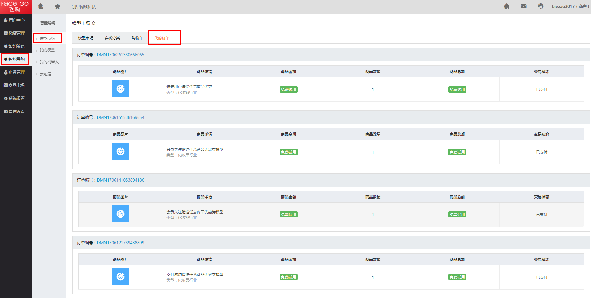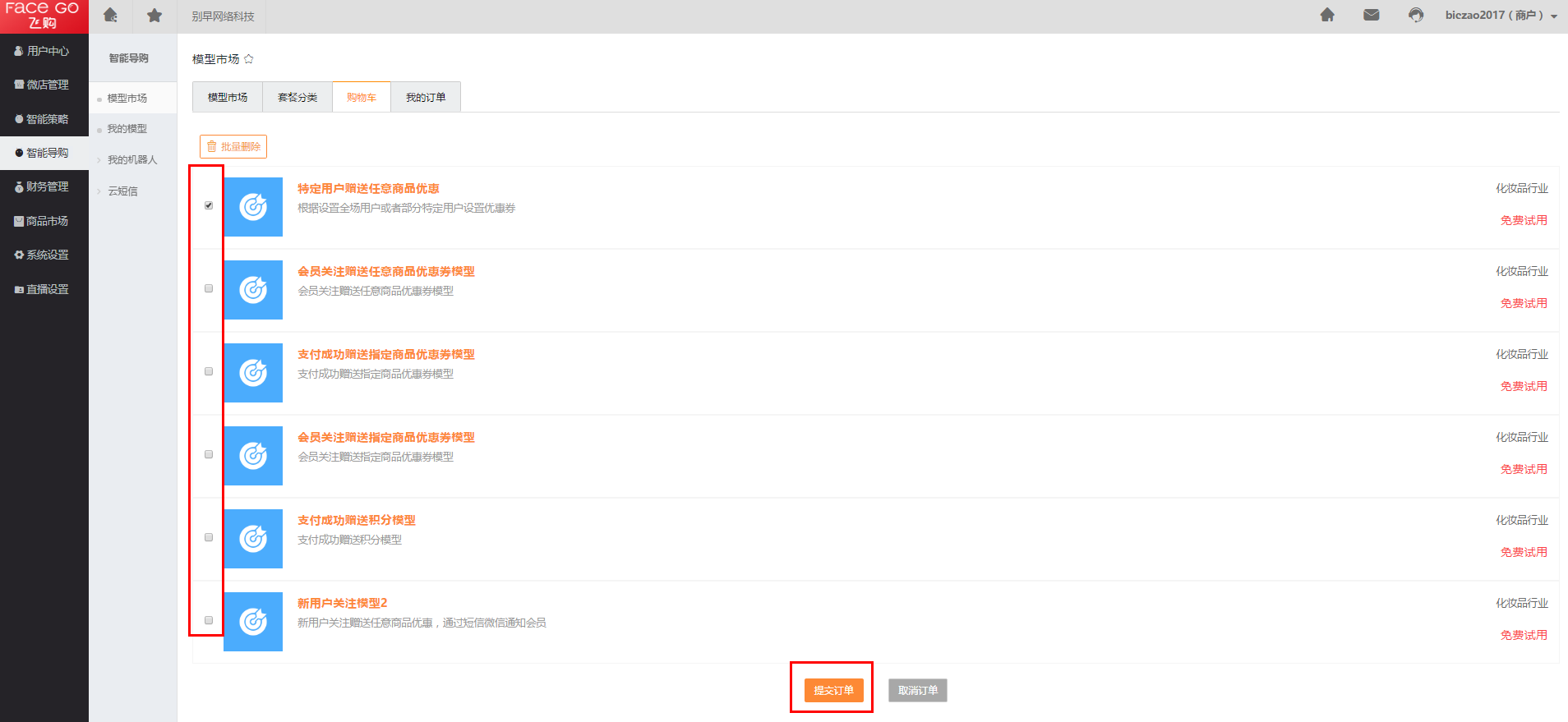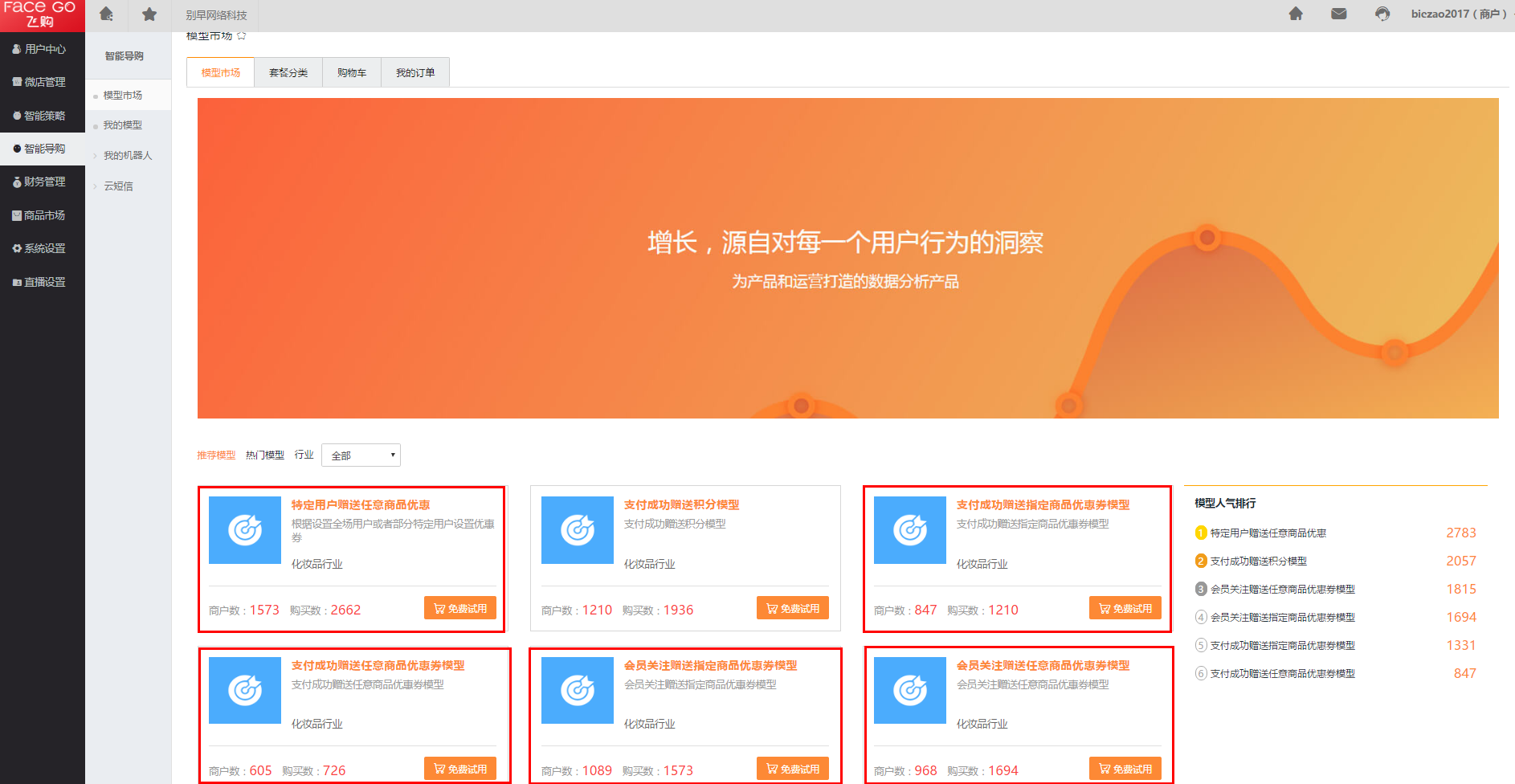 第一步 智能导购—模型市场—选择优惠券模型—点击【免费试用】