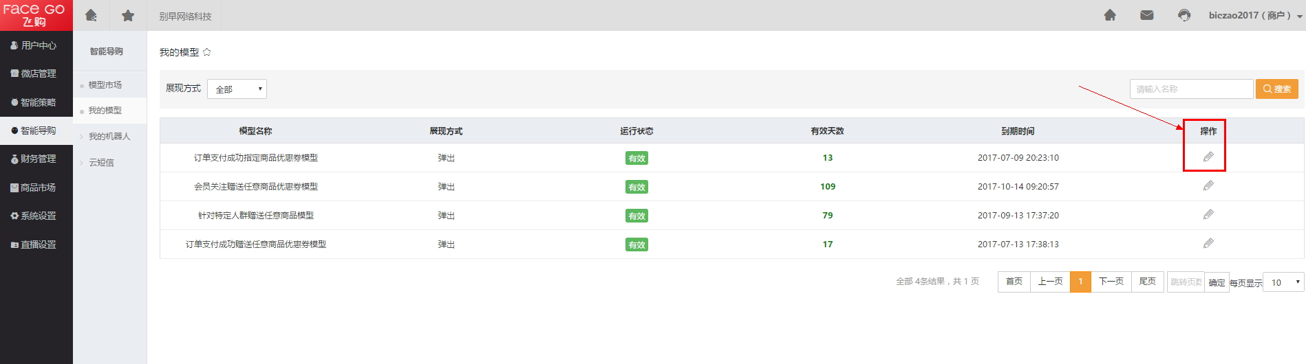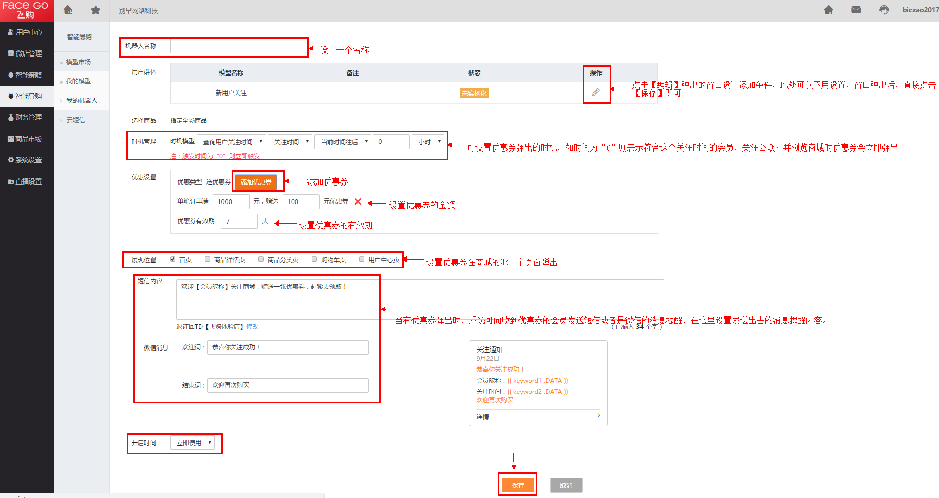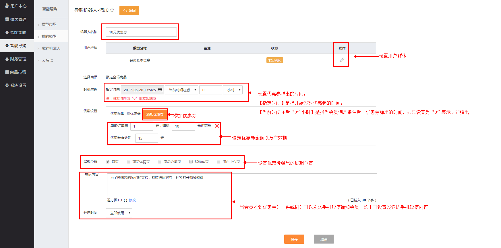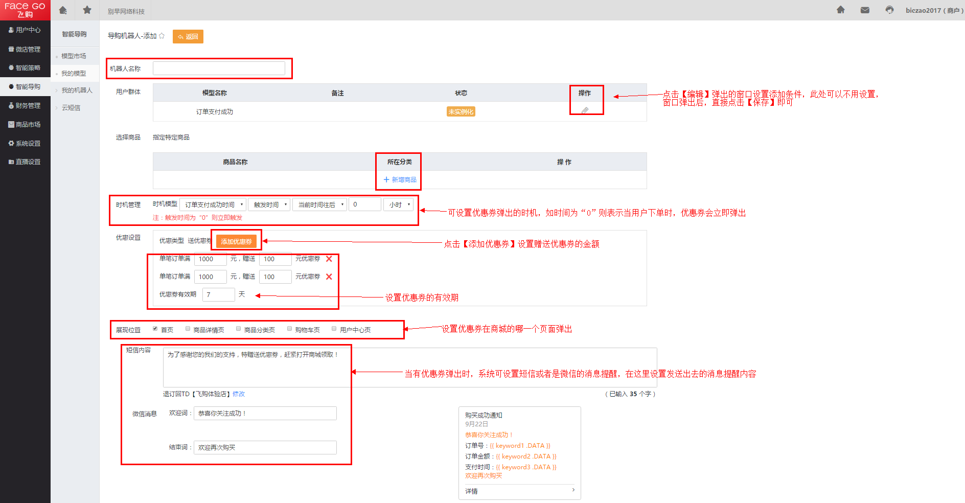 第三步 编辑优惠券发放规则:操作路径:智能导购—我的模型—编辑