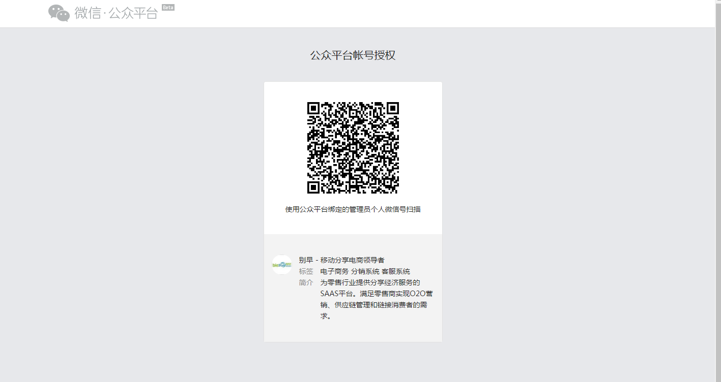第五步 系统弹出【公众号账号授权】二维码页面,然后用户使用绑定微信公众号的管理员个人微信扫描这个二维码;