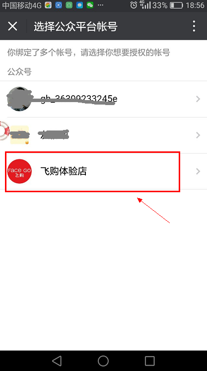第六步 手机微信扫码成功后,手机端会弹出页面,选择需要授权的公众号名称: