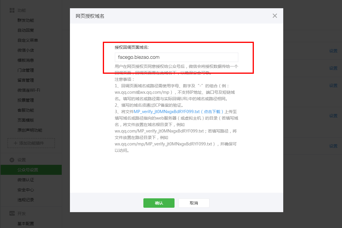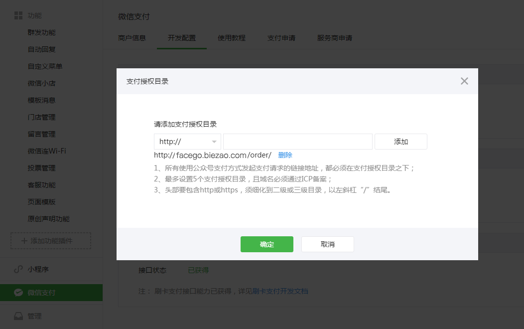 【支付授权目录】的修改页面中,选择【http://】填入网址:facego.biezao.com/order/ ;然后点击【添加】