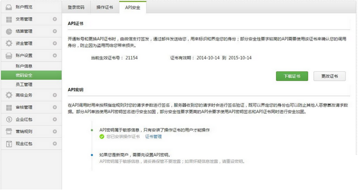 1、登录微信商户号后,找到账户设置 -> 密码安全 -> API安全 -> API密钥;