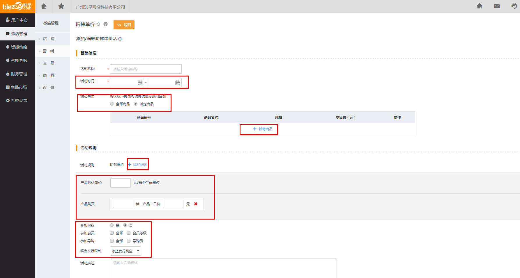 第二步 可以选择【全部商品】或者【指定商品】,填写相应的活动信息及活动参与的会员类型、规则,点击完成: