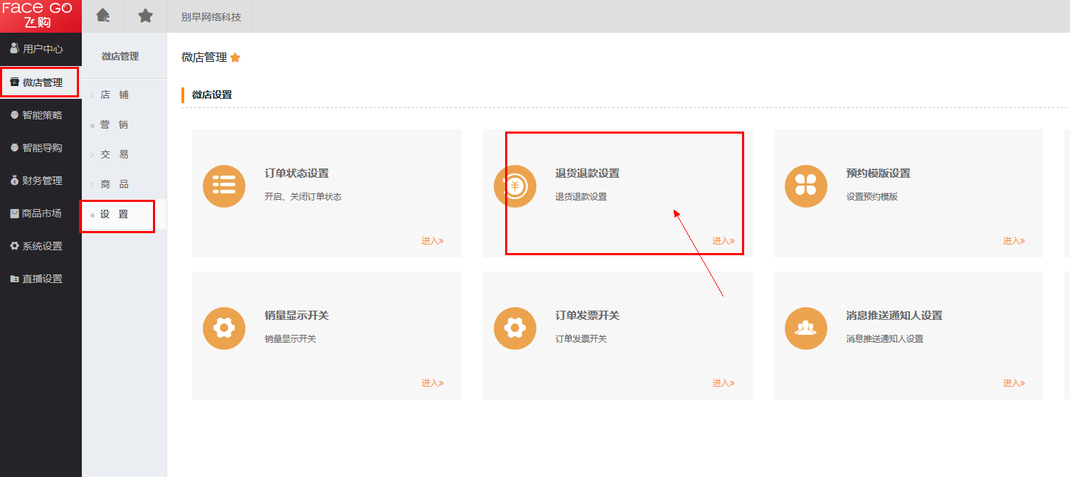 第一步 进入退款退货设置页面,操作路径:微店管理 -> 设置 -> 退货退款设置。