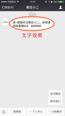自动回复功能设置“按关键字回复”、“关注回复”、“默认回复”等功能。您可以设定常用的文字/图文/图片/作为回复消息,并制定自动回复的规则。当订阅用户的行为符合自动回复规则的时候,就会收到自动回复的消息。